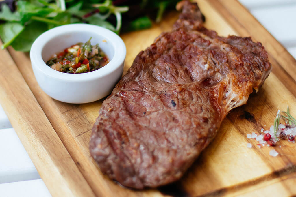 El New York Steak es un corte de carne con una buena cobertura de grasa que le da un excelente sabor. Corresponde a la parte media del lomo y de un músculo que trabaja poco, por lo que es una carne tierna y suave.